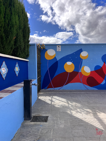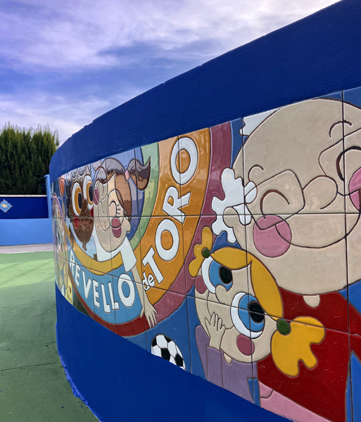 ¡El mural más grande hasta la fecha! El mural sirve de marco a toda la vida escolar y se compone 810 metros cuadrados repartidos en cuatro rampas, tres muros adyacentes, zona de aparcamiento y columnas del porche. El diseño, que rinde homenaje al pintor Félix Revello de Toro y al arte en múltiples manifestaciones, está concebido como un todo y se puede percibir de forma unitaria desde un punto rojo situado en la salida al patio.