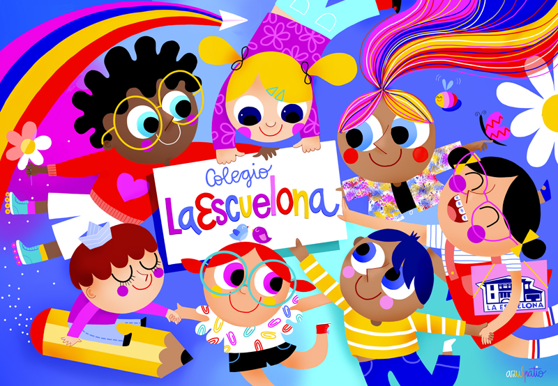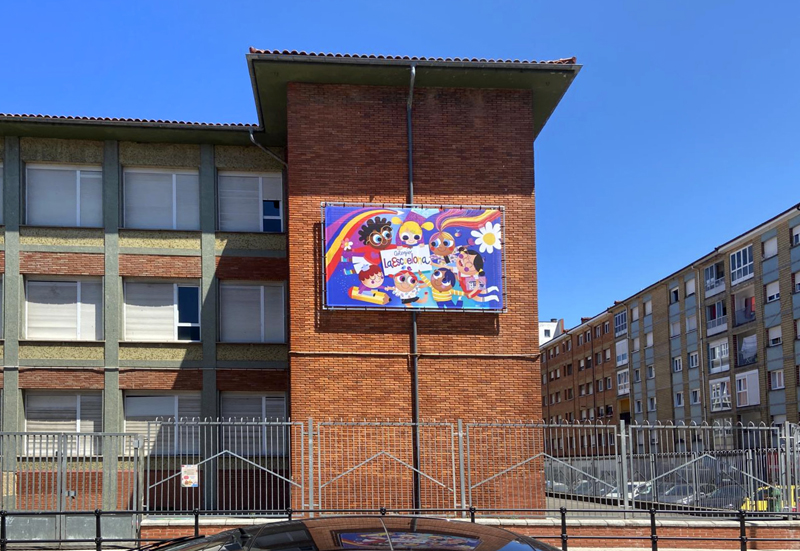En la fachada, una lona de gran tamaño refleja el espíritu y la alegría del cole y a la vez conecta con el estilo y paleta cromática de la entrada.