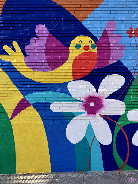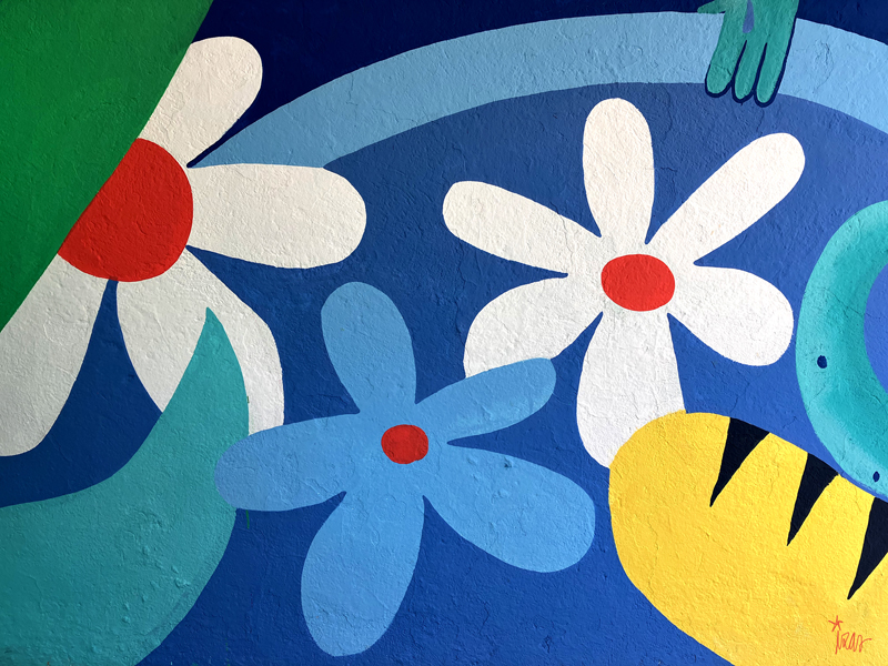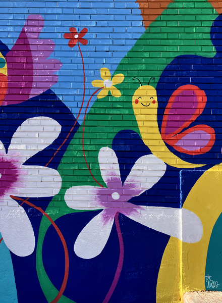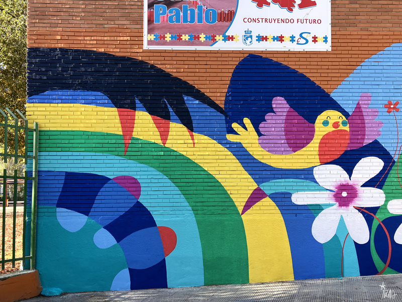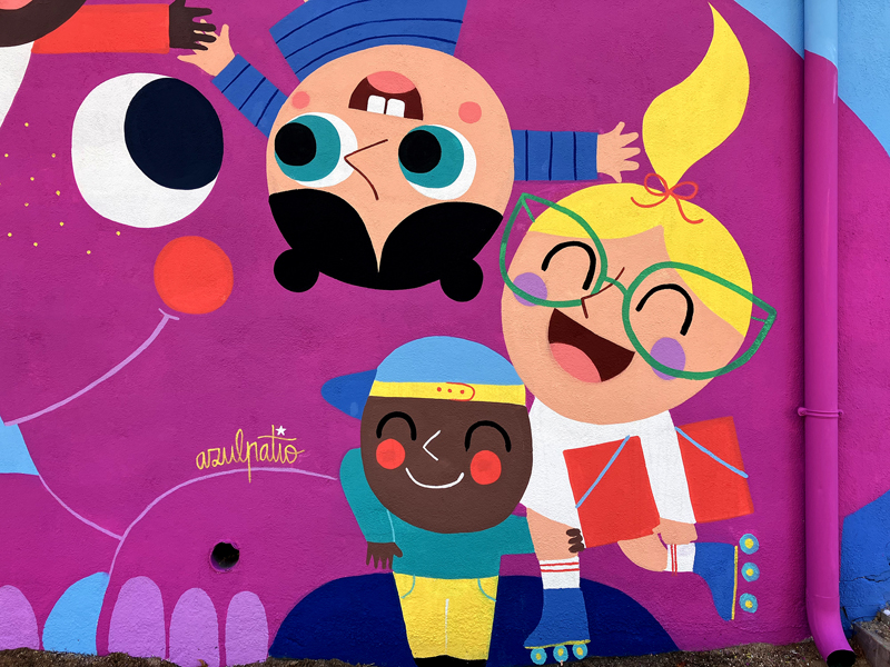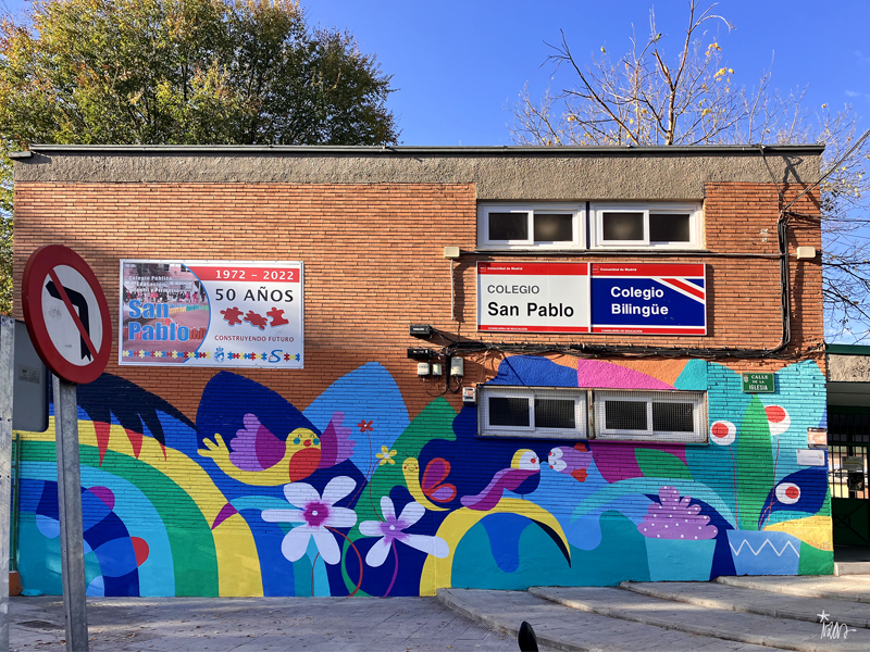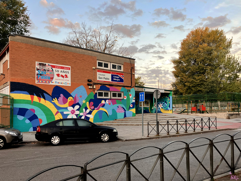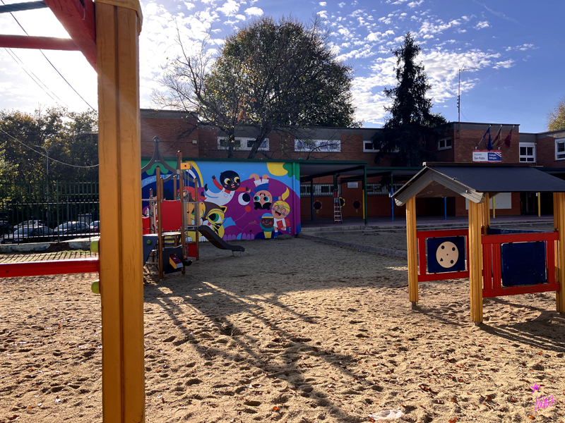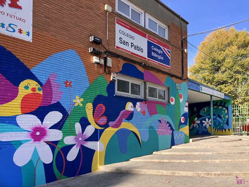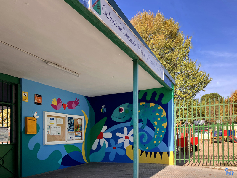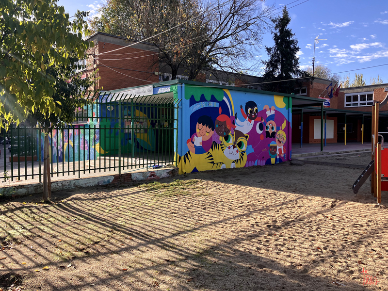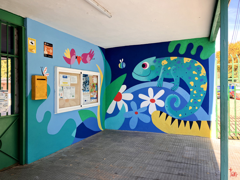 Una transformación total de la fachada, el porche y el patio Infantil con estos tres murales encadenados que se inspiran en la naturaleza, el color, la diversidad y la vida que se respira en el centro. Los colores armonizan con la perfilaría verde del edificio y el entorno arbolado del patio, logrando coherencia y continuidad visual entre todos los espacios.