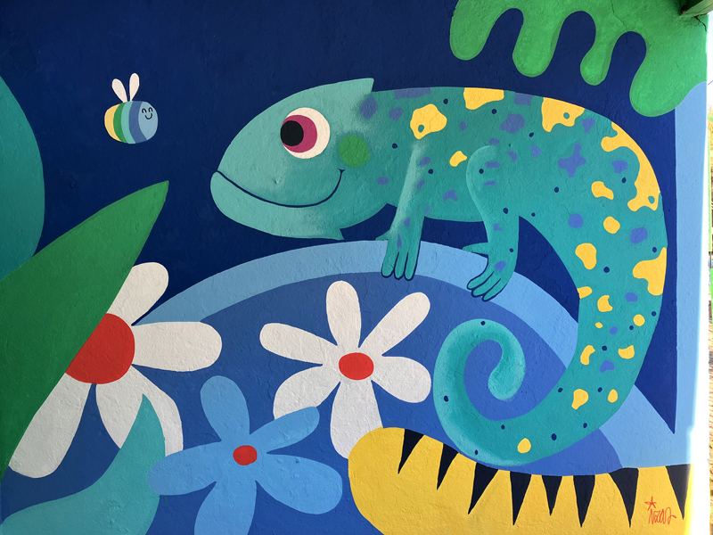 En la fachada exterior, el mural con grandes flores, hojas y pequeños animales simboliza la sostenibilidad y el cariño hacia el entorno. Un gran camaleón en la entrada conecta visualmente con la fachada y con el patio infantil, acompañado de aves y mariposas que se integran en la estructura del espacio, invitando a entrar al colegio con una sonrisa.