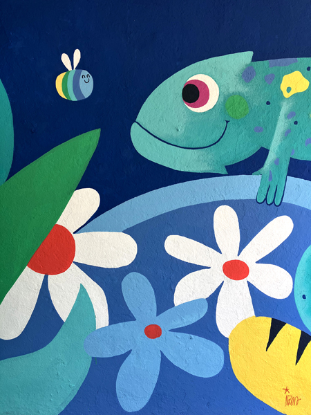 En el porche trasero retomamos un lenguaje vegetal con motivos sencillos, arcoíris y pequeños animales, cerrando visualmente el recorrido y manteniendo la armonía con el resto de zonas.