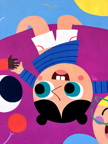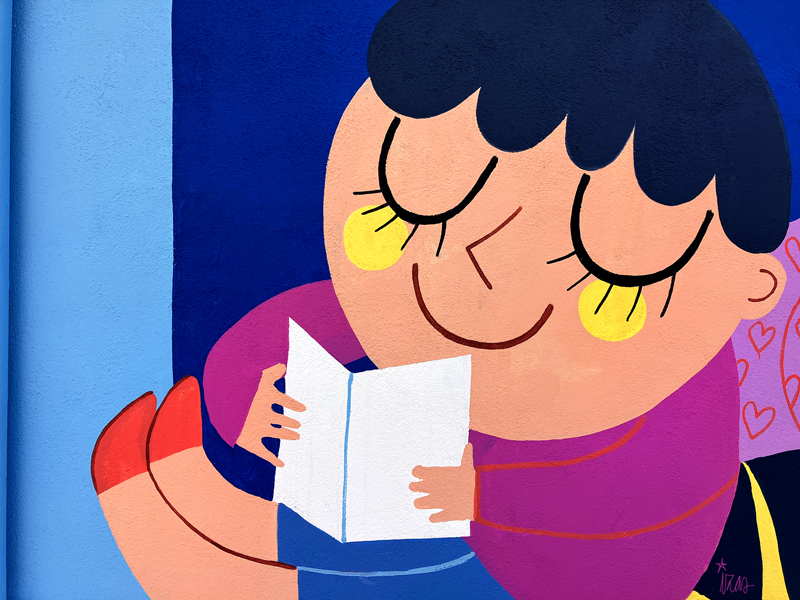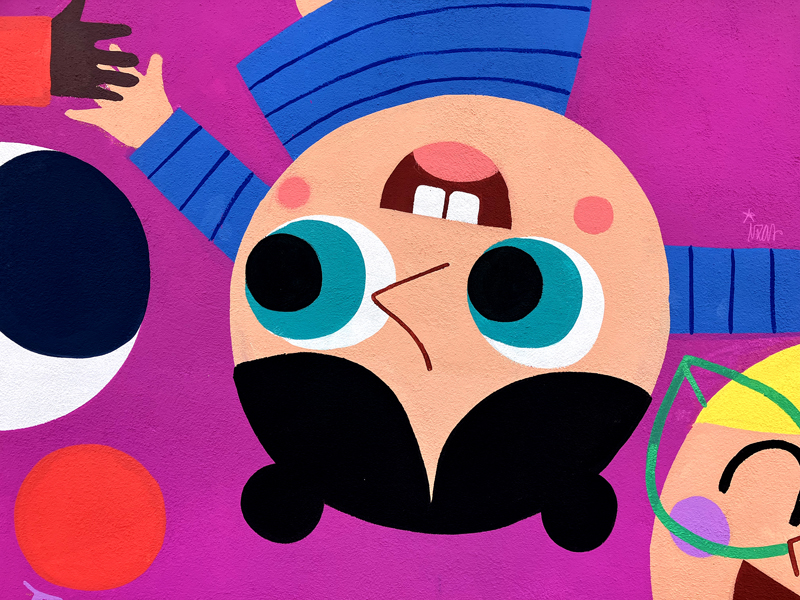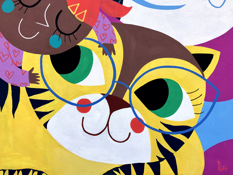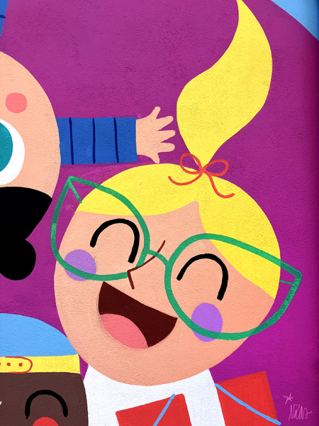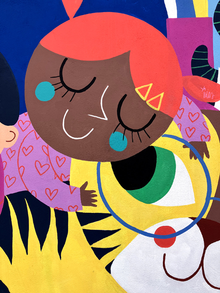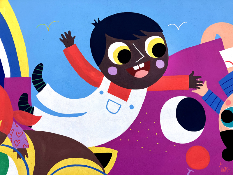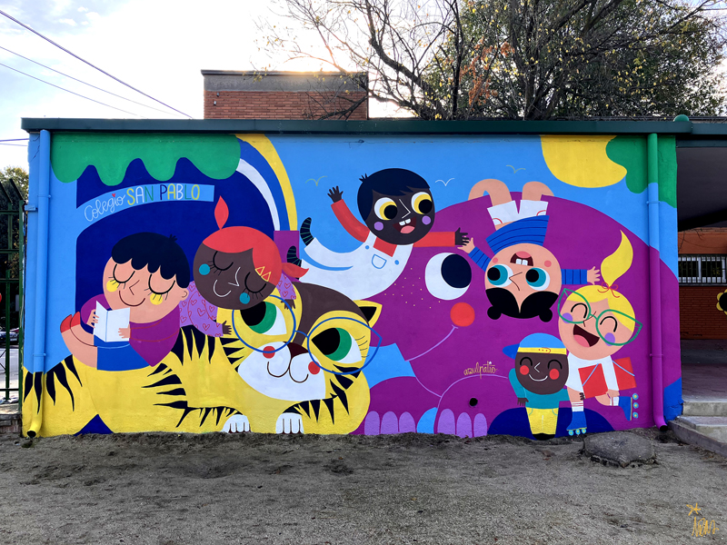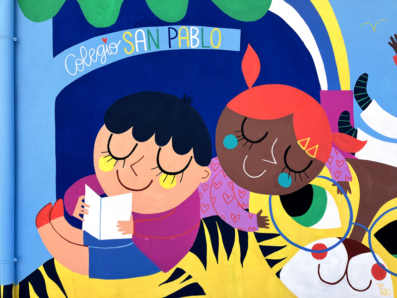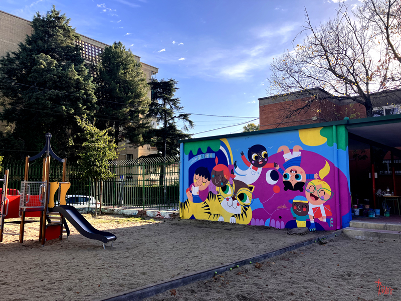 En el patio infantil, un tigre y un elefante adorables sirven de nexo con la fachada y juegan y leen con un grupo de niños y niñas que a su vez transmiten valores como la la igualdad, la amistad y el respeto, creando una comunidad inclusiva y alegre.