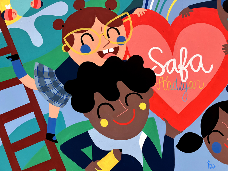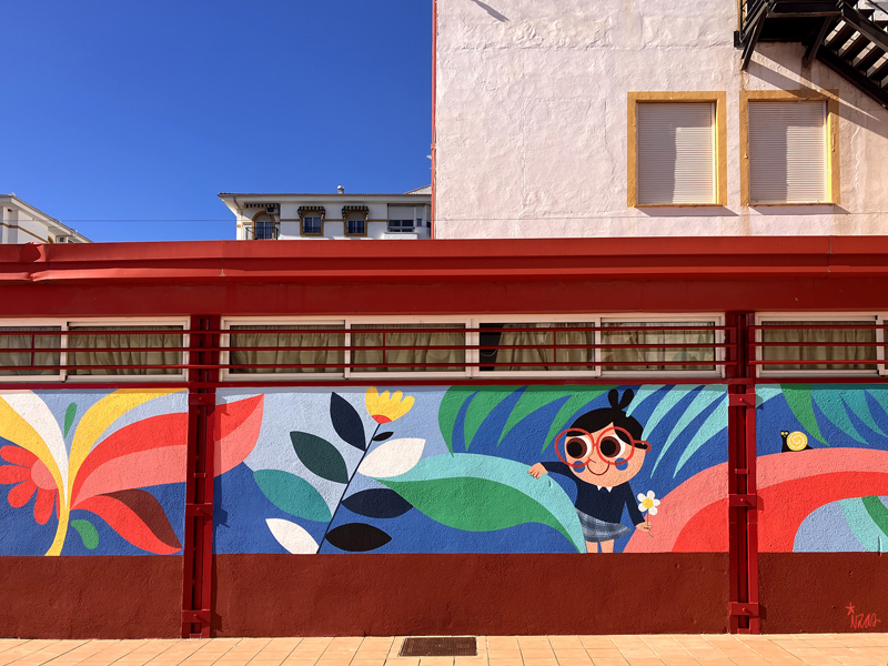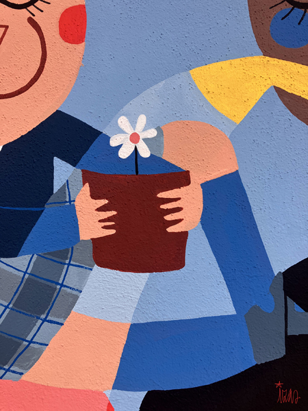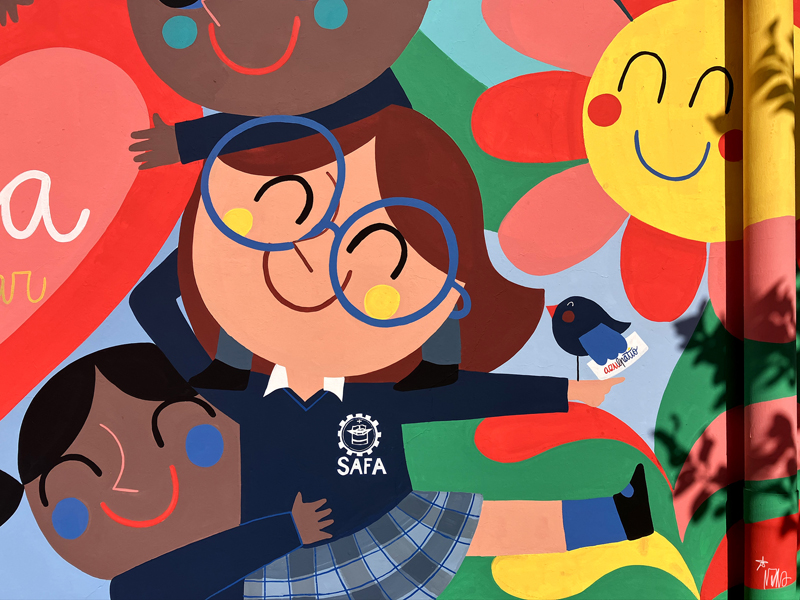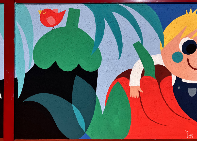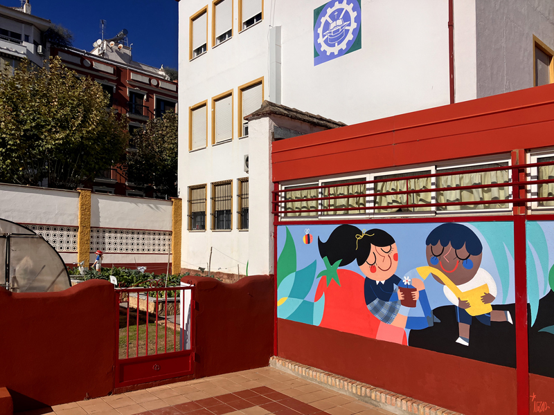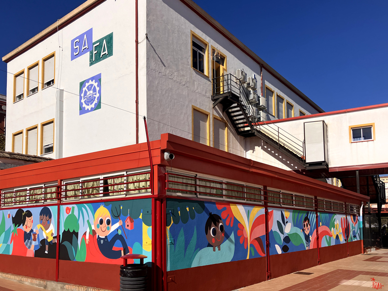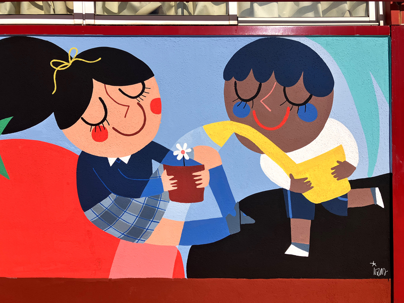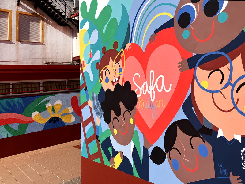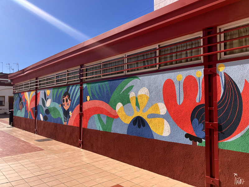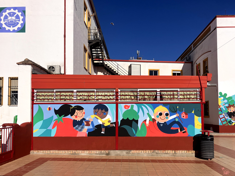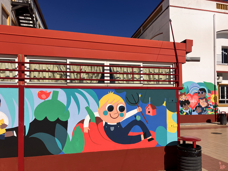 La composición continúa con un tramo floral, lleno de frescura y movimiento, que también incluye un par de figuras infantiles semiocultas entre la vegetación, para terminar con el gran mural de la pared frontal. Una escena con niños y niñas de diversas edades y orígenes en torno a un gran corazón reflejan valores como la convivencia y la amistad. Un gran sol preside la escena, creando una atmósfera cálida y luminosa.