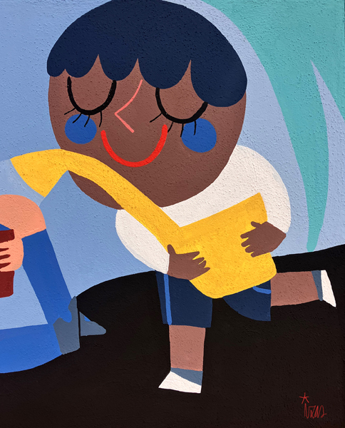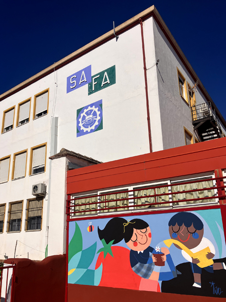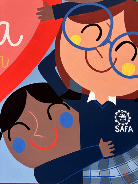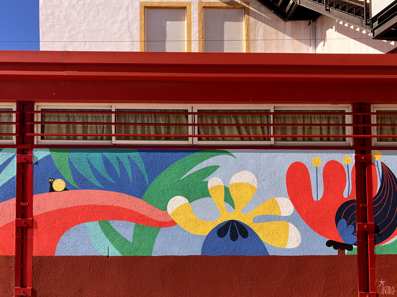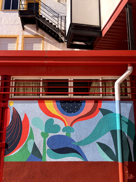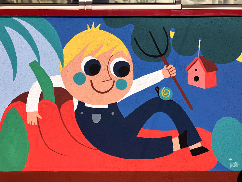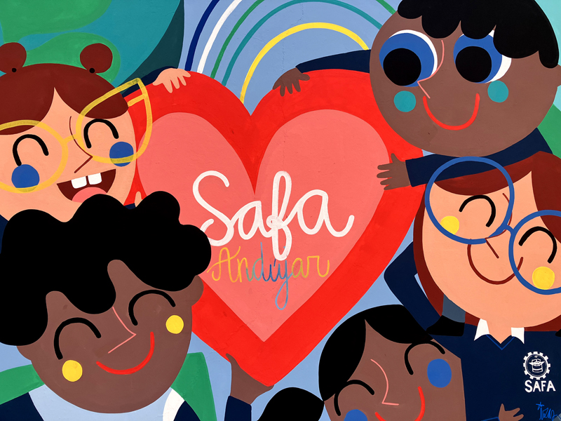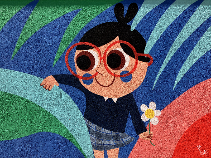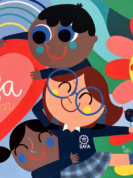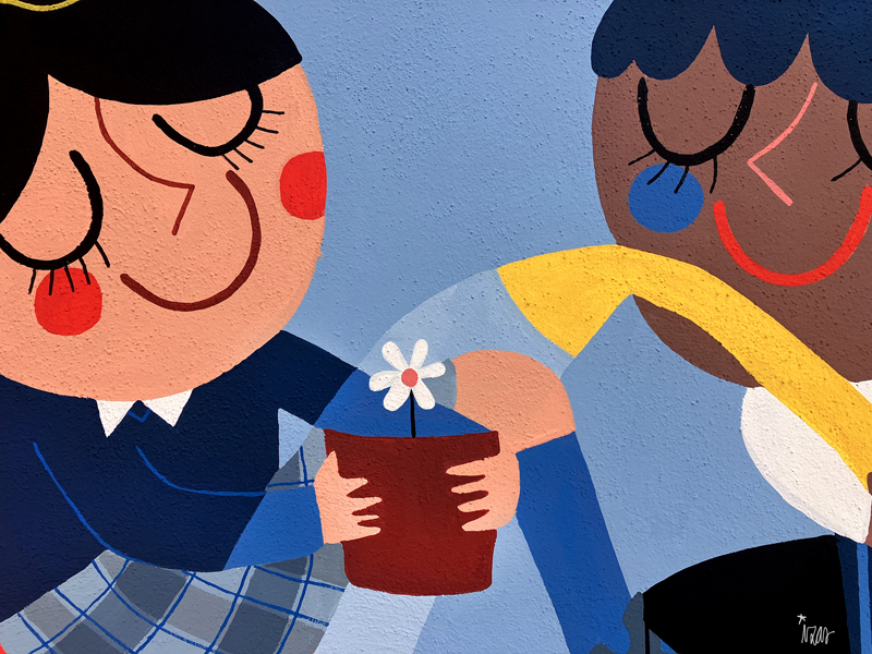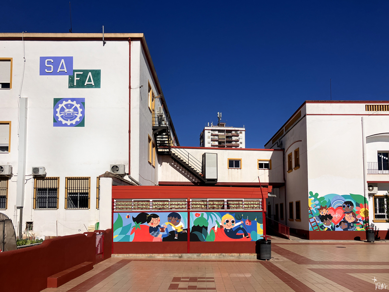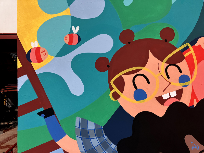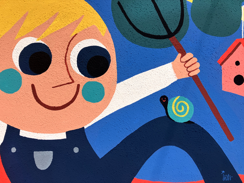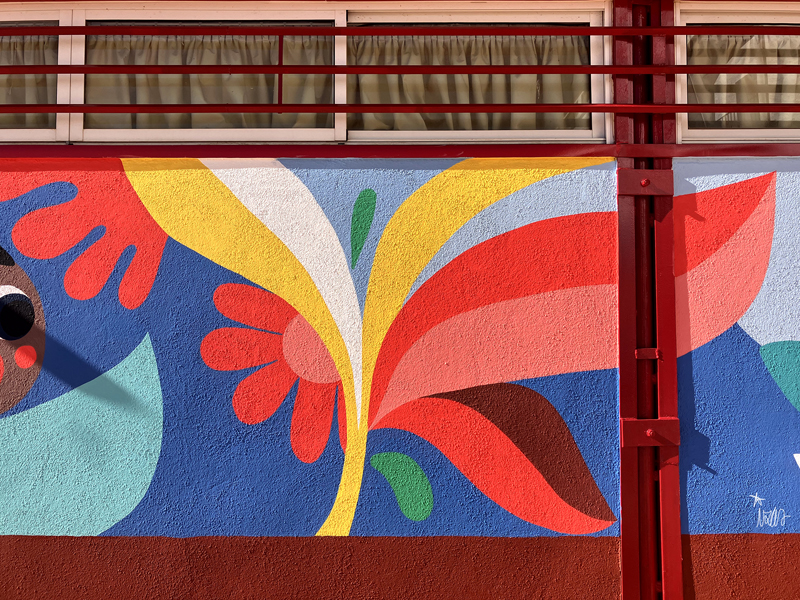 La composición continúa con un tramo floral, lleno de frescura y movimiento, que también incluye un par de figuras infantiles semiocultas entre la vegetación, para terminar con el gran mural de la pared frontal. Una escena con niños y niñas de diversas edades y orígenes en torno a un gran corazón reflejan valores como la convivencia y la amistad. Un gran sol preside la escena, creando una atmósfera cálida y luminosa.
